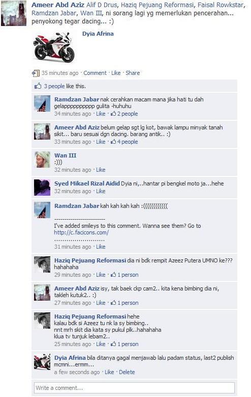 Dek kerana tak tahu nak bagi jawapan, lebai Ameer telah publishkan kat wall seperti kat atas tew. so lebai Ameer ni pun tagla rakan selabainya untuk membahankan Dyia. Bacul sangat ke sampai perlu rakan ramai-ramai nak jawab hujah dan persoalan pendek? Soalan yang mudah jer [betul ker? ada bukti keluaran mana yg ada bincang pasal ni?] itu jer.